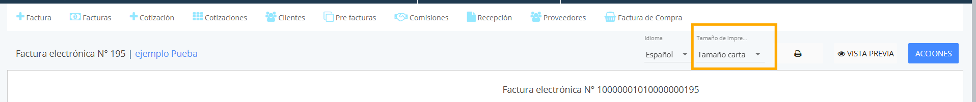 En la siguiente imagen se muestra la opción para selección de tamaño de impresión en una factura ya confeccionada: