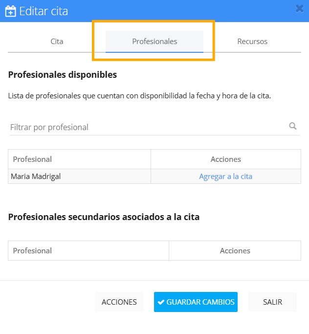 Ahora cada cita va a poder ser asignada a más de 1 profesional, activando la opción de profesionales secundarios, esto va a permitir bloquear el espacio de más de 1 profesional a la vez, de esta forma, si un paciente va a ser atendido por más de 1 profesional y se requiere bloquear el espacio, se va poder asociar dicha cita a los profesionales que sean necesarios, respetando los horarios y disponibilidad de cada profesional.