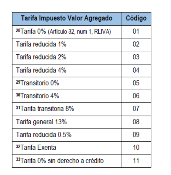 Al confeccionar documentos electrónicos (facturas, notas de crédito o débito), se deben utilizar siempre un código de tarifa del IVA, los cuales han sido definidos por el Ministerio de Hacienda de Costa Rica.
